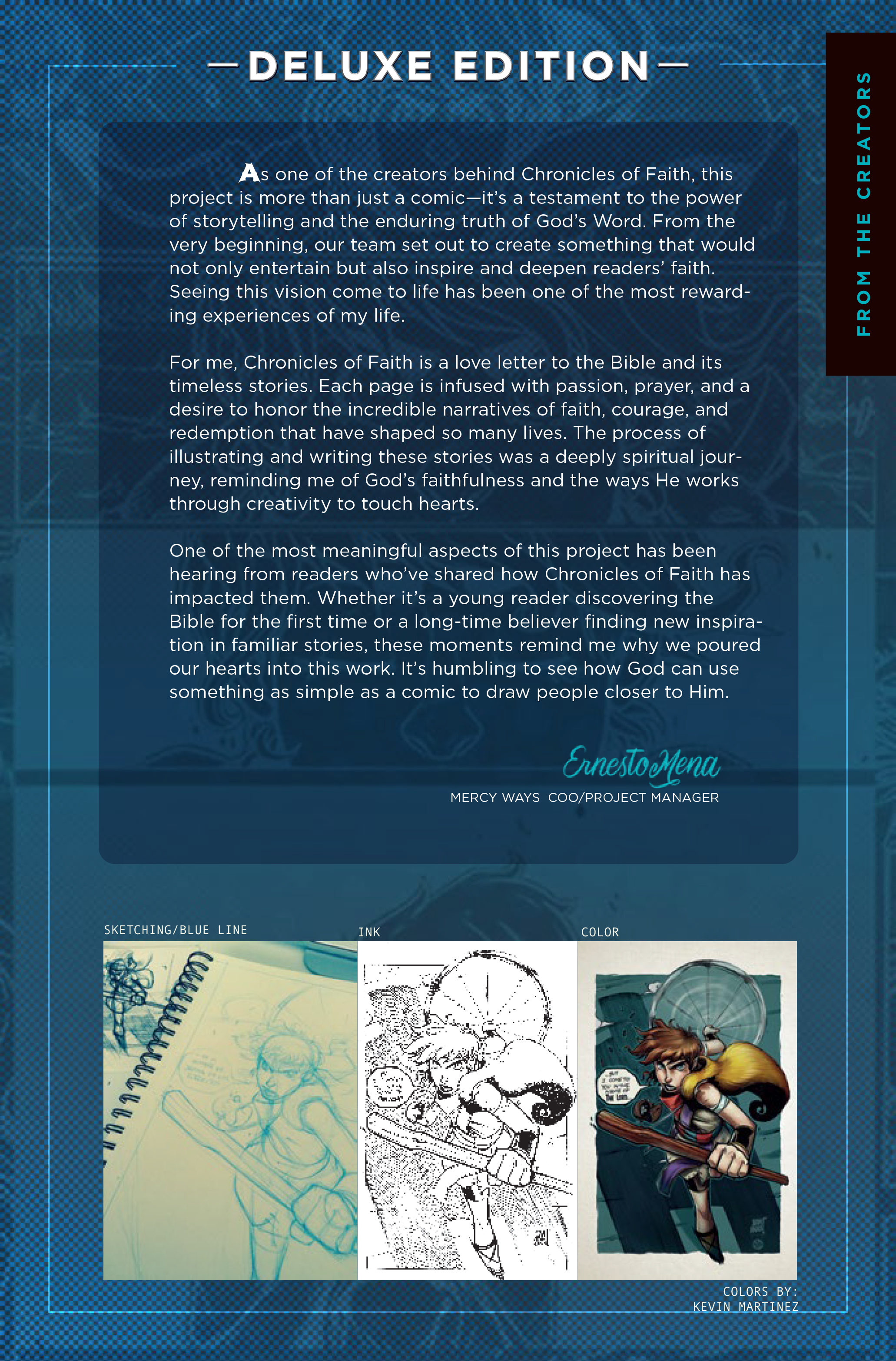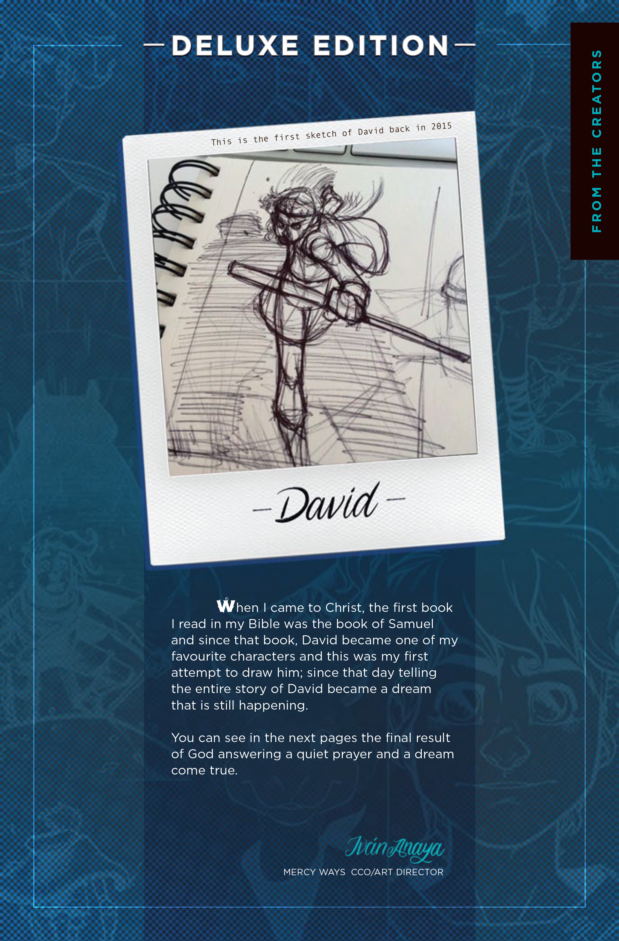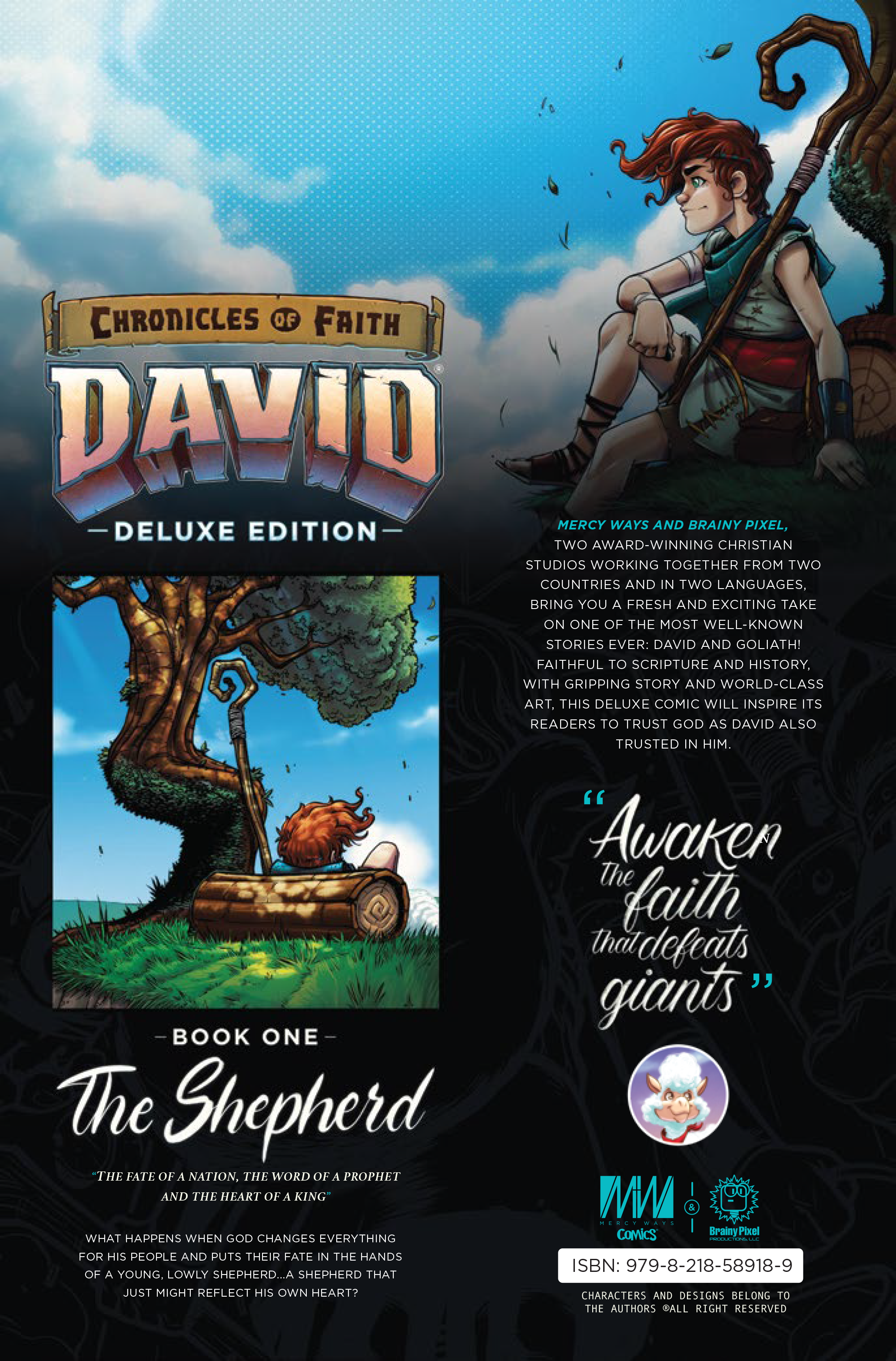 This Deluxe Edition of Chronicles of Fatih: David combines the amazing art and story from Issues 00, 01, and a colored version of Sheepe's Story (Part 1) into one high-quality, glossy thing of beauty! Enjoy the amazing beginning of David's story as he begins the journey from Shepherd to King, plus amazing, never-before-seen pre-production art and behind-the-scenes peeks into the process of making this award-nominated and genre-defining comic!Follow the action-packed, epic story of the life of David, as revealed in scripture, in this phenomenal graphic novel! David's journey begins as a simple boy who is destined for so much more in this Deluxe edition graphic novel which compiles Issues 00, 01, and a brand-new prequel story in color for the very first time, not to mention tons of amazing Pre-production art never before seen! Experience the tension and excitement as young David faces his biggest challenges yet, but in a way, you'd never see coming. With 120 pages of full-color breathtaking artwork and gripping storytelling, this issue brings the Bible to life like never before. Explore themes of courage, humility, and God's providence in this thrilling beginning of David's epic and true story.