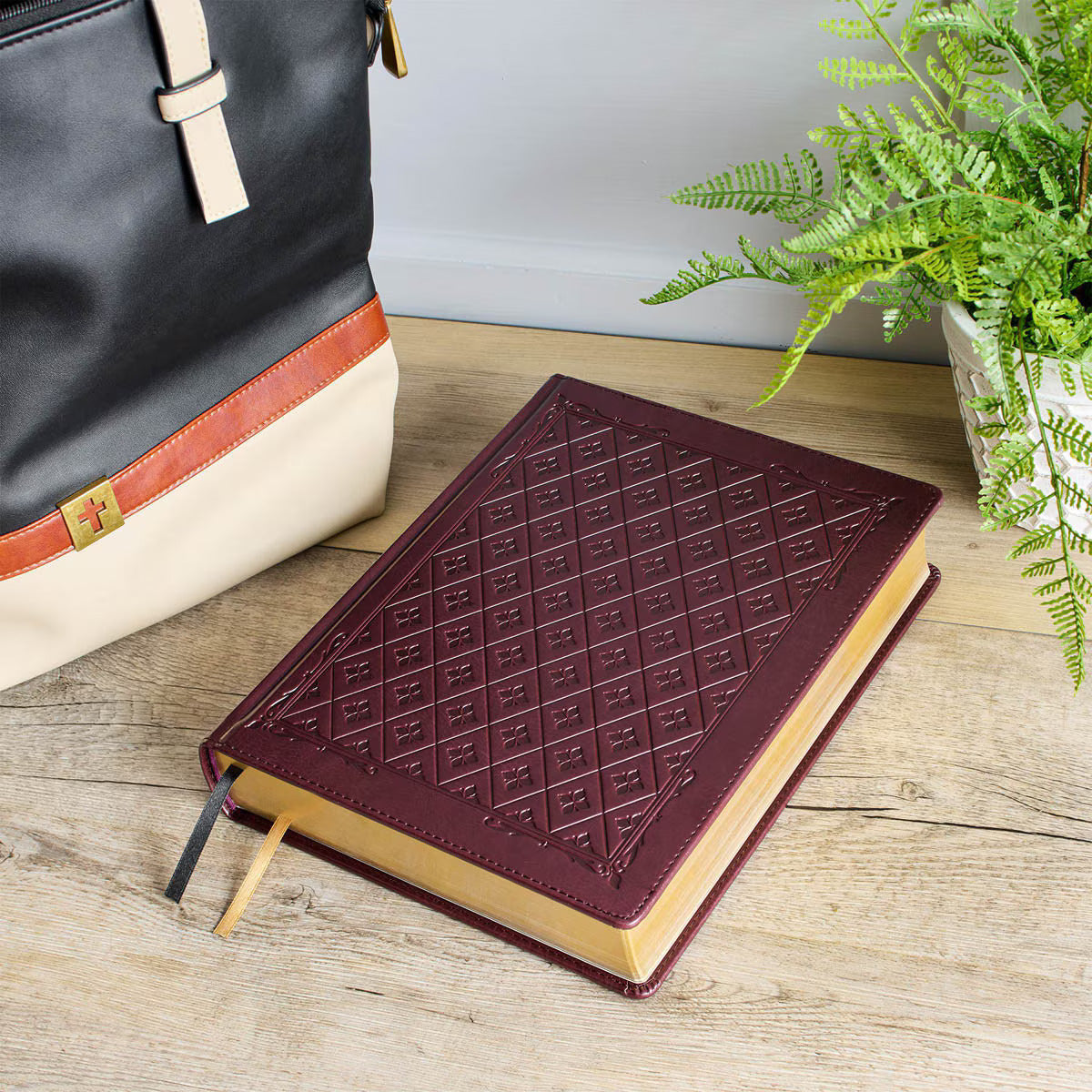 Ideal for gifting around the holidays or to mark a baptism or confirmation, the Burgundy Diamond Grid Faux Leather Hardcover Large Print King James Version Note-taking Bible would be well-received by any relative or friend.