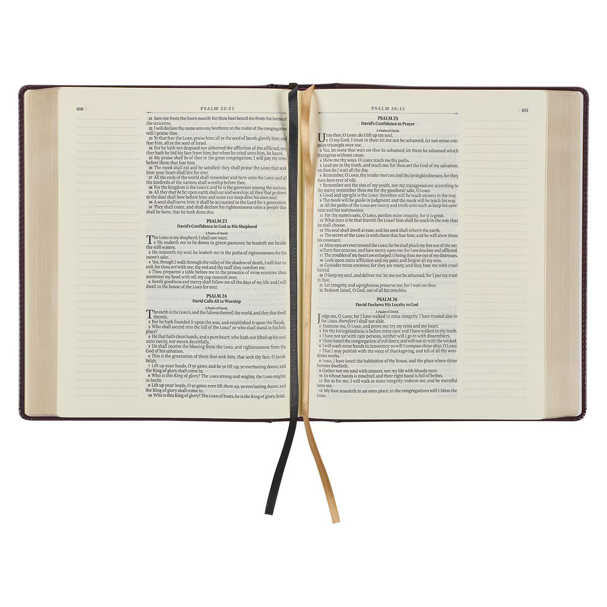 The 10.8-point type ensures the printing is readable without strain, and the 2.5-inch wide margins features 1.8-inch lines that let you take notes while studying the Word. The entire KJV Bible is presented in the original 1769 English text with added reader-friendly subheadings. Additional study helps are also available in this Bible and include two satin ribbon markers, a thematic Scripture verse finder, a concordance, a one-year Bible reading plan, and 8 full-color maps. The Epistle Dedicatory to the original KJV Bible is included for historical reference and several pages are included in the back for your own notes. The Bible is packaged in a full-color printed cardstock sleeve.
