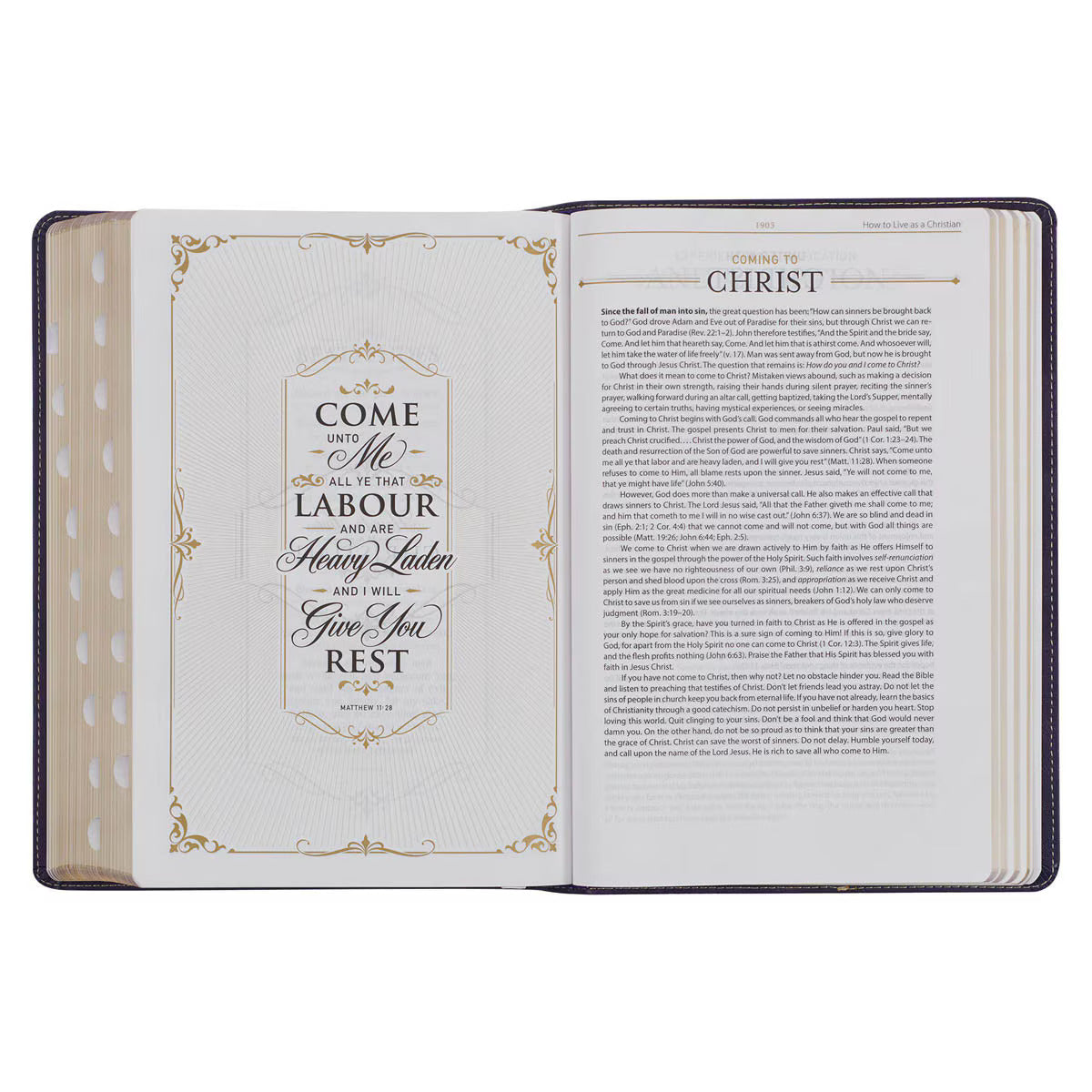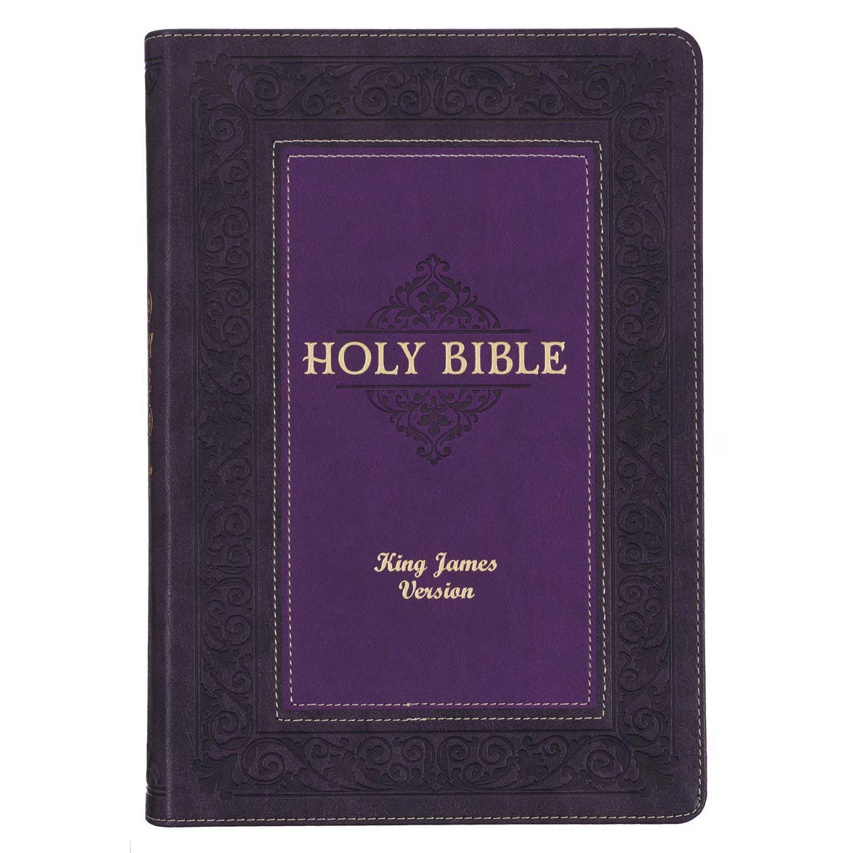 Immerse yourself in profound spiritual exploration with the elegant Two-tone Purple Faux Leather Large Print King James Version Study Bible with Thumb Index. With its large print and emphasis on daily devotions, it serves as the ideal companion for your personal Bible study journey.