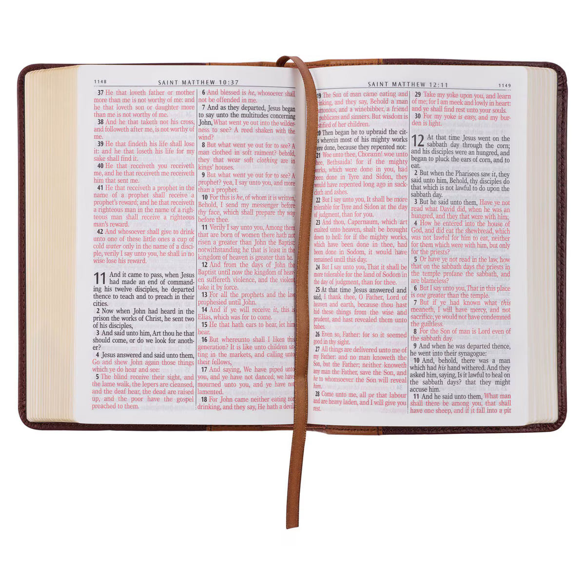 The Saddle Tan and Butterscotch Large Print Compact King James Version Bible delivers the best of both worlds: great portability in an easy-to-read format. Not only is this compact Bible's size ideal for travel, but it is slightly larger than average 10-point text size reduces eye strain.